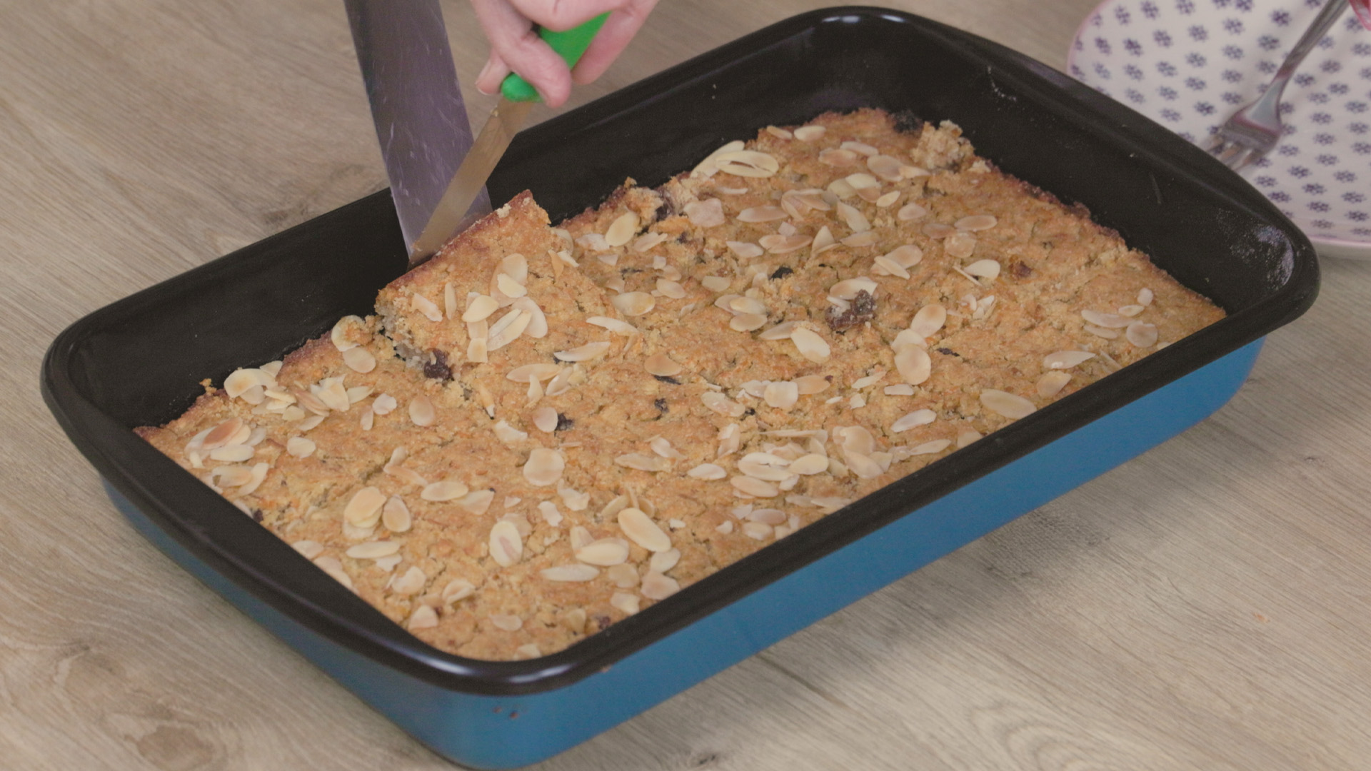 Die Kuchenform einfetten und mit Mehl bestäuben oder mit Backpapier auslegen. Den Backofen auf 180-190°C Ober-/Unterhitze vorheizen. Die Rosinen oder Aprikosen klein schneiden und in Mandelmilch einweichen lassen.