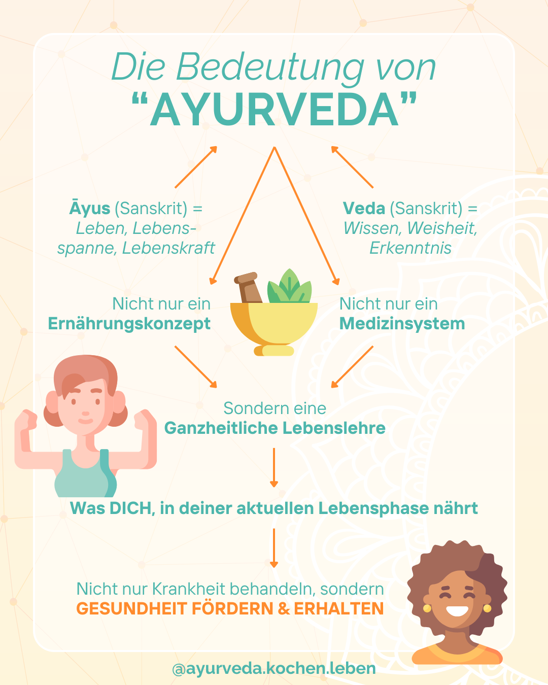Ayurveda heißt also wörtlich übersetzt: „Das Wissen vom Leben" oder „Die Wissenschaft des Lebens". Und genau das ist es - eine umfassende Lehre darüber, wie wir unser Leben in Einklang mit den natürlichen Gesetzmäßigkeiten führen können.